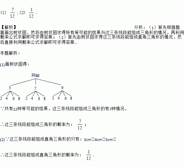 (1) ;(2) . 【解析】分析:(1)首先根据题意画出树状图,然后由树状图求得所有等可能的结果与这三条线段能组成三角形的情况,再利用概率公式求解即可求得答案;(2)首先由树状图求得这三条线段能组成直角三角形的情况,然后直接利用概率公式求解即可求得答案. 本题解析: (1)画树状图得: ∵共有12种等可能的结果,这三条线段能组成三角形的有7种情况, ∴这三条线段能组...