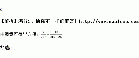 家在农村的小李家卖猪,为了揭露收购者短斤少两的行为,在收购者称一头猪重207斤并还没有被放下的时候,快速在猪身上放了事先称好的准确的10斤重的铁块,结果称得216斤.假设猪的实际重x斤,则根据题意,列方程得( )