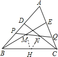 如图在△ABC中,D、E分别为AB、AC上的点,且BD=CE,M、N分别是BE、CD的中点.过MN的直线交AB于P,交AC于Q,线段AP、AQ相等吗?为什么?![]()