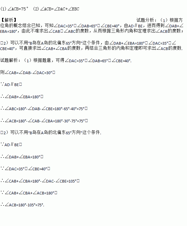 (1)∠ACB=75° (2)∠ACB=∠DAC+∠EBC 【解析】试题分析:(1)根据方位角的概念结合已知,可知∠DAC=35°,∠DAB=65°,∠CBE=40°,由AD∥BE,进而得到∠DAB+∠EBA=180°,由此不难求出∠CAB,∠ABC的度数,从而根据三角形内角和定理求出∠ACB的度数; (2)可以不用“B岛在A岛的北偏东65°方向”这个条件,由∠DAB+∠EBA=180...