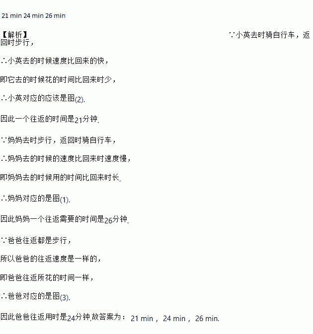 小英、爸爸、妈妈同时从家中出发到达同一目的地后都立即返回,小英去时骑自行车,返回时步行;妈妈去时步行,返回时骑自行车;爸爸往返都步行,三人步行的速度不等,小英与妈妈骑车的速度相等,每个人的行走路程与时间的关系分别是下图中的一个,走完一个往返,小英用时____________,爸爸用时____________,妈妈用时____________.