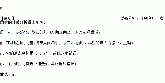 B 【解析】试题分析:分别利用二次函数的性质分析得出即可. 【解析】 A、∵a=2>0,故它的开口方向是向上,故此选项错误; B、在y轴左侧,y随x的增大而减小,故当x<﹣1时,y随x的增大而减小,正确; C、它的顶点坐标是(0,3),故此选项错误; D、当x=0时,y有最小值是3,故此选项错误; 故选:B.
