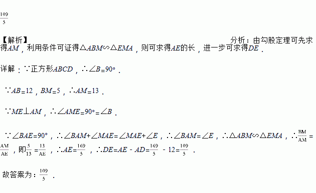 如图,正方形ABCD中,M为BC上一点,ME⊥AM,垂足为M,ME交AD的延长线于点E.若AB=12,BM=5,则DE的长为_____.