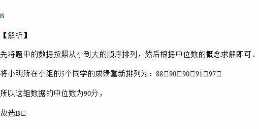 一次数学测试中,小明所在小组的5个同学的成绩(单位:分)分别是:90、91、88、90、97,则这组数据的中位数是( )