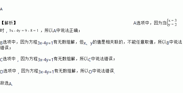 C. 方程3x-4y=1只有两组解,两组解分别是: