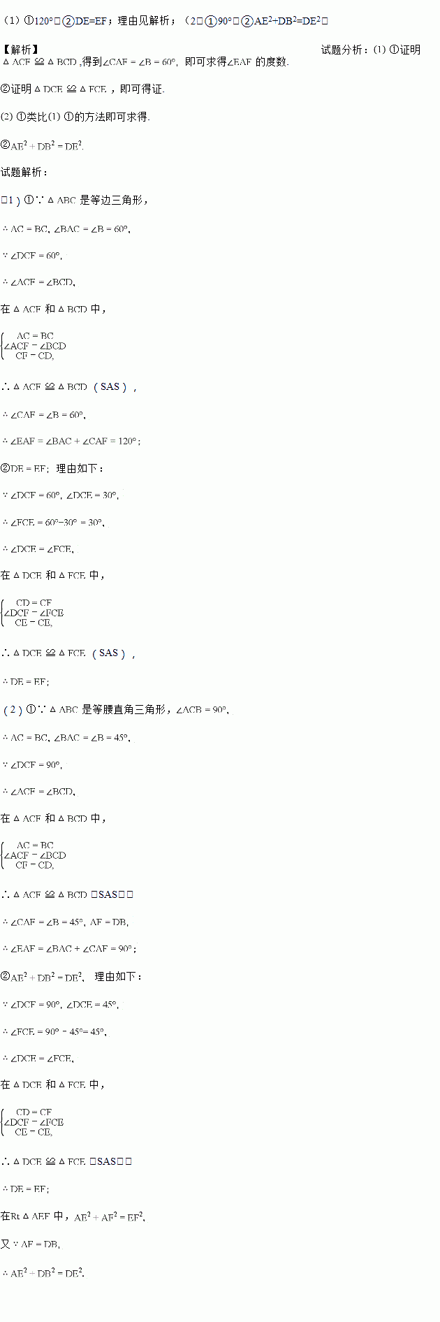 (2)类比探究:如图2,△ABC为等腰直角三角形,∠ACB=90°,点D为AB边上的一点,∠DCE=45°,CF=CD,CF⊥CD,请直接写出下列结果: