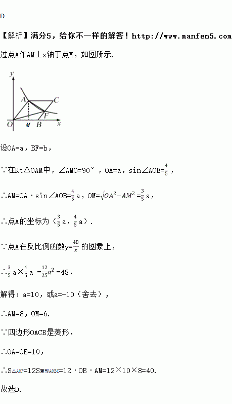 (2016山东省济宁市)如图,O为坐标原点,四边形OACB是菱形,OB在x轴的正半轴上,sin∠AOB=