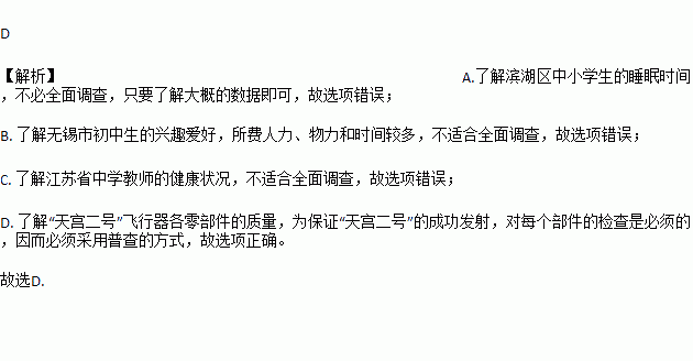 C. 了解江苏省中学教师的健康状况 D. 了解“天宫二号”飞行器各零部件的质量