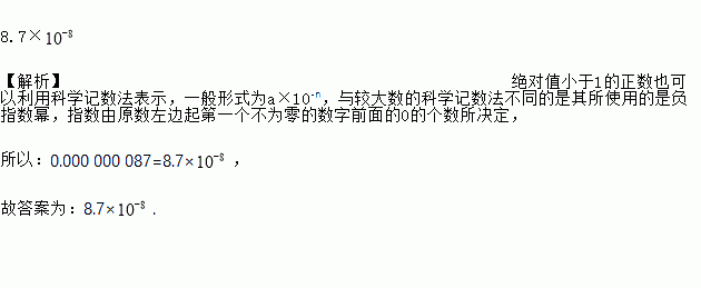 8.7× 【解析】绝对值小于1的正数也可以利用科学记数法表示,一般形式为a×10-n,与较大数的科学记数法不同的是其所使用的是负指数幂,指数由原数左边起第一个不为零的数字前面的0的个数所决定, 所以:0.000 000 087=8.7×, 故答案为:8.7×.