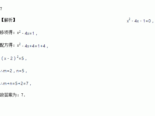 将方程x2﹣4x﹣1=0化为(x﹣m)2=n的形式,其中m,n是常数,则m+n=_____.