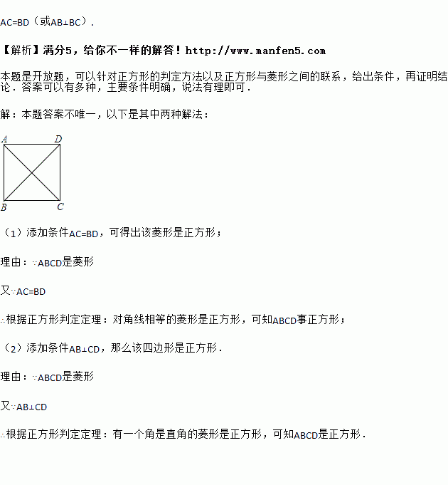 ,请你添加一个条件:________,使得该菱形为正方形.![]()