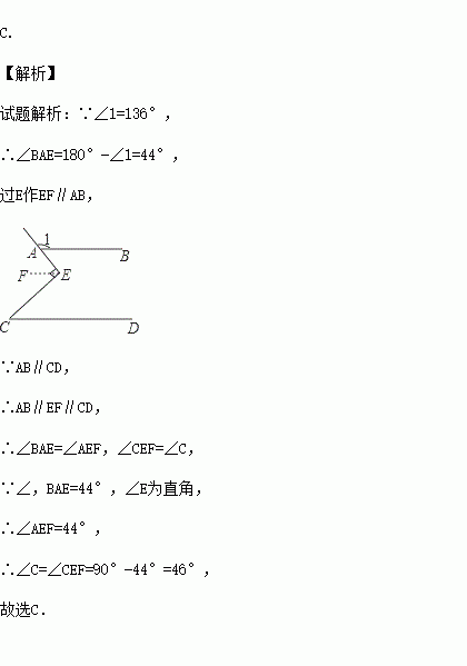 如图,直线AB∥CD,∠1=136°,∠E为直角,则∠C等于( )