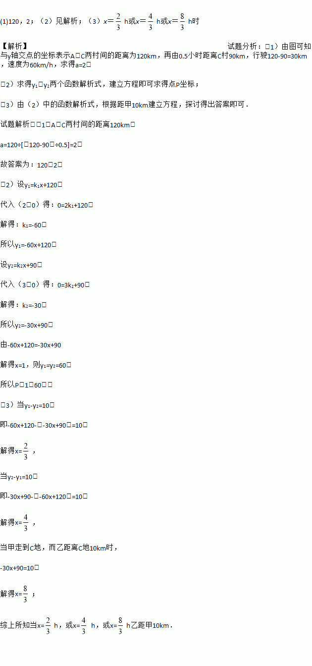 (1)120,2;(2)见解析;(3)x=h或x=h或x=h时 【解析】试题分析:(1)由图可知与y轴交点的坐标表示A、C两村间的距离为120km,再由0.5小时距离C村90km,行驶120-90=30km,速度为60km/h,求得a=2; (2)求得y1,y2两个函数解析式,建立方程即可求得点P坐标; (3)由(2)中的函数解析式,根据距甲10km建立方程,探讨得出答案即可. ...