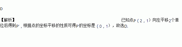 将点P(2,1)向左平移2个单位后得到P’,则P’的坐标是( )