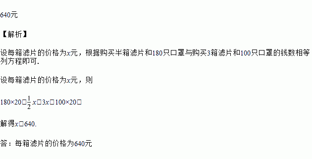 戴口罩是抵御雾霾的无奈之举,某公司打算采购一批防雾霾口罩和滤片,已知口罩的价格为20元/只,公司预算可以购买半箱滤片和180只口罩;或者也可以购买3箱滤片和100只口罩,求每箱滤片的价格.