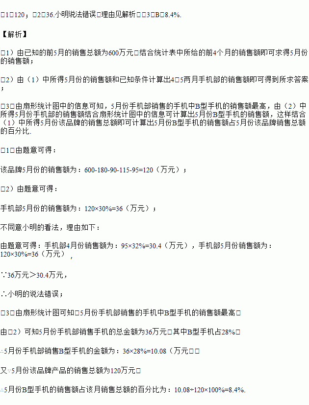 小明同学观察图1后认为,手机部5月份的销售额比手机部4月份的销售额减少了,你同意他的看法吗?请说明理由;