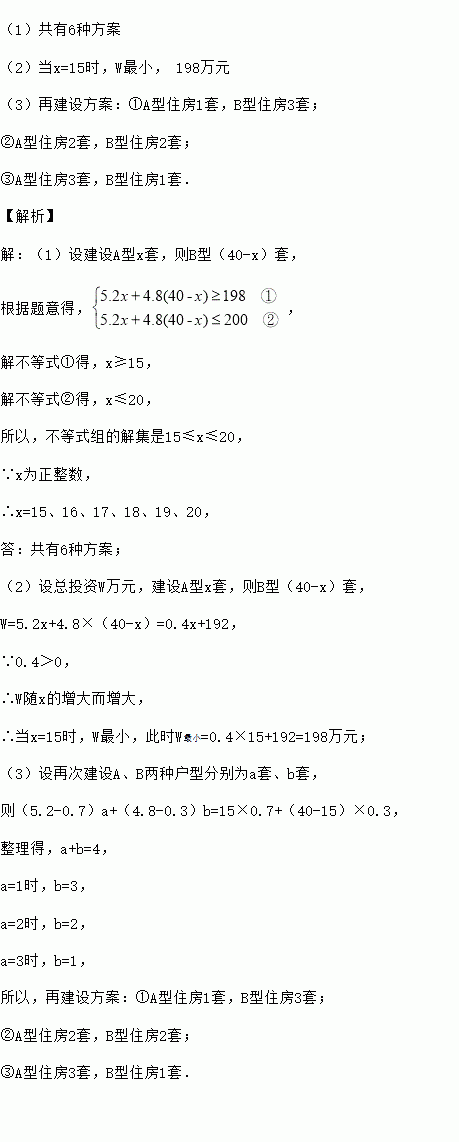 为了落实党中央提出的“惠民政策”,我市今年计划开发建设A、B两种户型的“廉租房”共40套.投入资金不超过200万元,又不低于198万元.开发建设办公室预算:一套A型“廉租房”的造价为5.2万元,一套B型“廉租房”的造价为4.8万元.