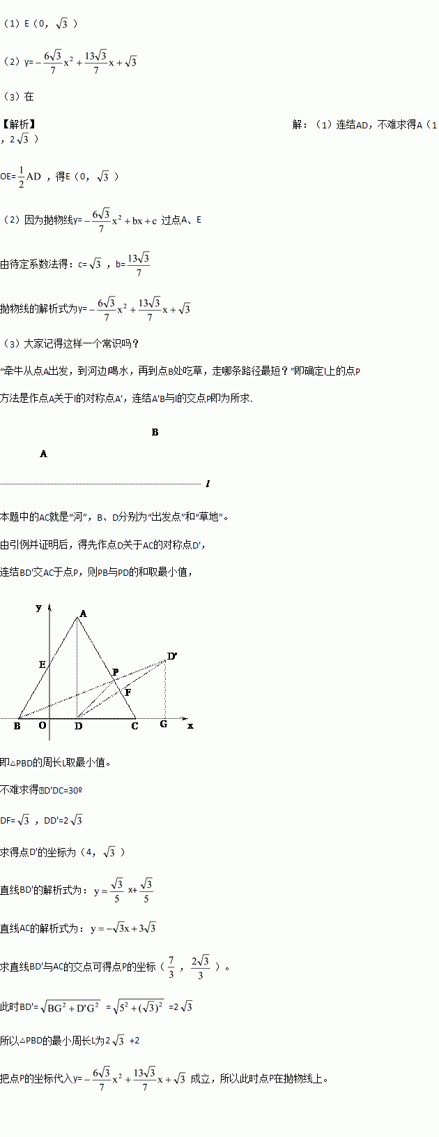 已知△ABC是边长为4的等边三角形,BC在x轴上,点D为BC的中点,点A在第一象限内,AB与y轴的正半轴相交于点E,点B(-1,0),P是AC上的一个动点(P与点A、C不重合)