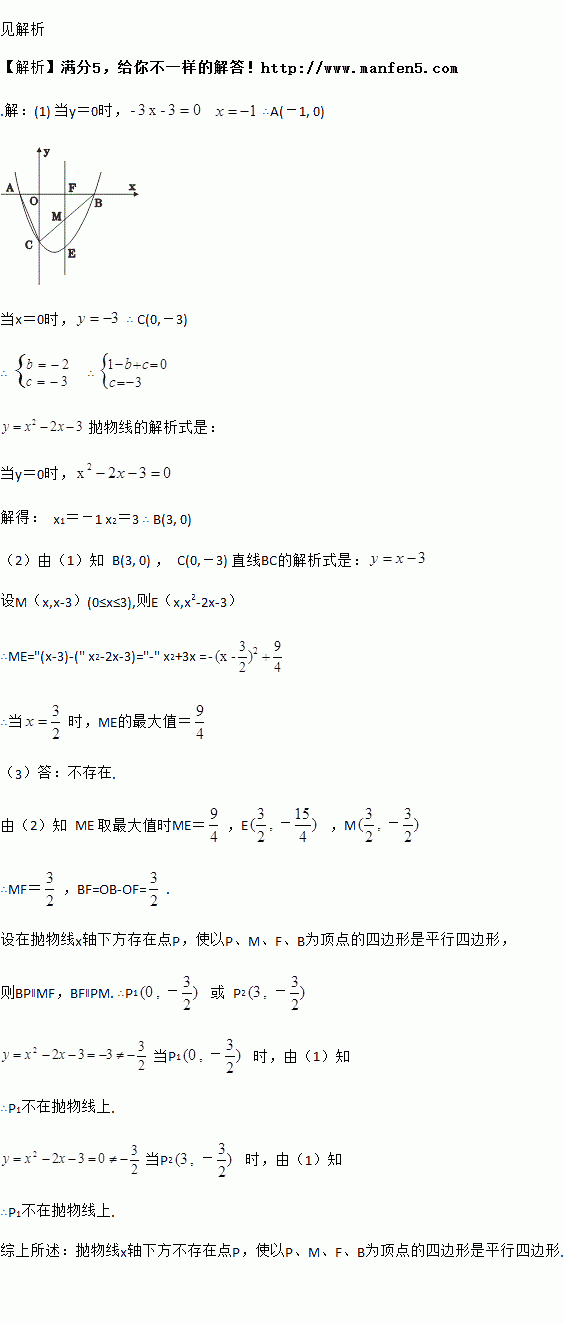 (3)试探究当ME取最大值时,在x轴下方抛物线上是否存在点P,使以M,F,B,P为顶点的四边形是平行四边形?若存在,请求出点P的坐标;若不存在,试说明理由.
