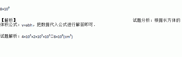 8×109 【解析】试题分析:根据长方体的体积公式:v=abh,把数据代入公式进行解答即可. 试题解析:4×103×2×103×103=8×109(cm3)