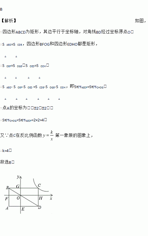B 【解析】如图, ∵四边形ABCD为矩形,其边平行于坐标轴,对角线BD经过坐标原点O, ∴S△ABD=S△CDB,四边形BFOG和四边形EDHO都是矩形, ∴S△OBF=S△OGB,S△OED=S△ODH, ∴S△ABD- S△OBF-S△OED =S△CDB-S△OGB-S△ODH,即S矩形AEOF=S矩形CHOG, ∵点A的坐标为:(﹣2,﹣2), ...