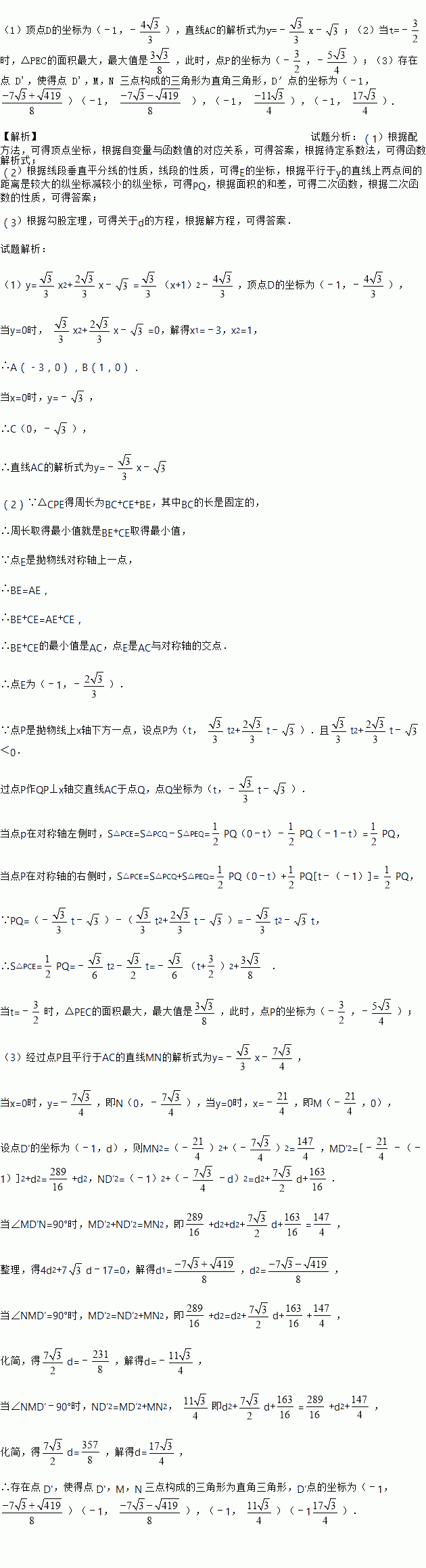 沿对称轴上下平移,平移后抛物线的顶点为 D',在平移的过程中,是否存在点 D',使得点 D',M,N 三点构成的三角形为直角三角形,若存在,直接写出点 D'的坐标;若不存在,请说明理由.
