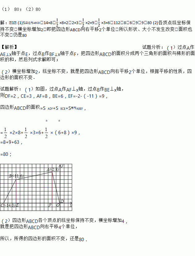 (2)如果把四边形ABCD各顶点纵坐标保持不变,横坐标增加2,所得的四边形面积又是多少?