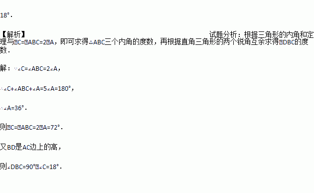 如图,在△ABC中,∠C=∠ABC=2∠A,BD⊥AC于D,求∠DBC的度数.