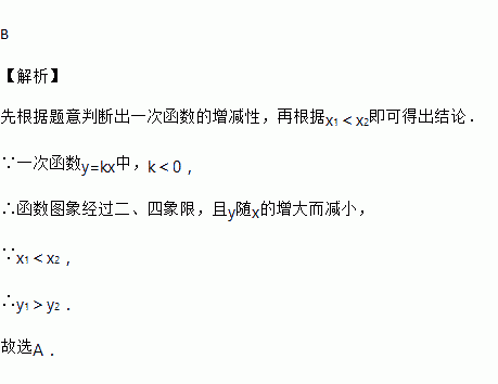 已知正比例函数y=kx(k<0)的图象上两点A(x1,y1)、B(x2,y2),且x1<x2,下列说法正确的是( )