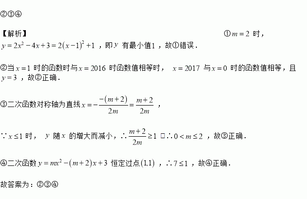 ②③④ 【解析】①时, ,即有最小值,故①错误. ②当时的函数时与时函数值相等时, 与时的函数值相等,且,故②正确. ③二次函数对称轴为直线, ∵时, 随的增大而减小,∴,∴,故③正确. ④二次函数恒定过点,∴,故④正确. 故答案为:②③④