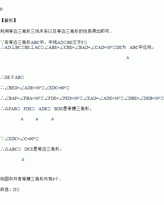 如图,在等边三角形ABC中,中线AD,BE交于F,则图中共有等腰三角形( )
