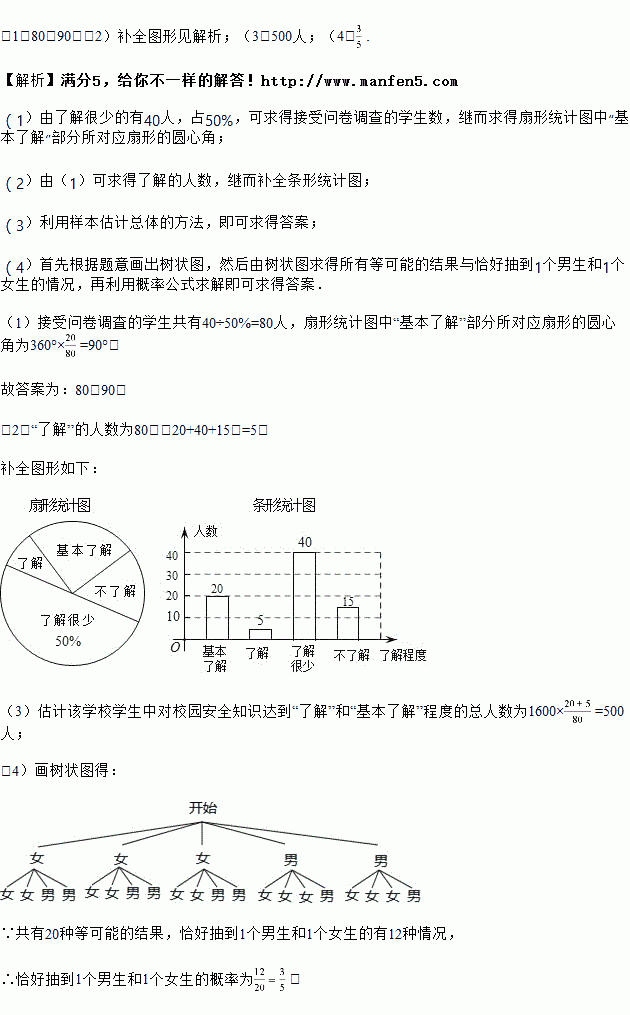 £¨4£©Èô´Ó¶ÔУ԰°²È«ÖªÊ¶´ïµ½¡°Á˽⡱³Ì¶ÈµÄ3¸öÅ®ÉúºÍ2¸öÄÐÉúÖÐËæ»ú³éÈ¡2È˲μÓУ԰°²È«ÖªÊ¶¾ºÈü£¬ÇëÓÃÊ÷״ͼ»òÁÐ±í·¨Çó³öÇ¡ºÃ³éµ½1¸öÄÐÉúºÍ1¸öÅ®ÉúµÄ¸ÅÂÊ£®