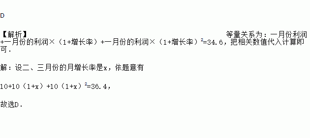 某公司今年销售一种产品,一月份获得利润10万元,由于产品畅销,利润逐月增加,一季度共获利36.4万元.设2,3月份利润的月增长率为x,那么x满足的方程为( )