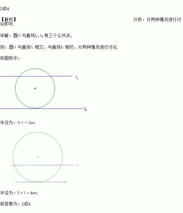 已知l1//l2,l1、l2之间的距离是3cm,圆心O到直线l1的距离是1cm,如果圆O与直线l1、l2有三个公共点,那么圆O的半径为_________cm.