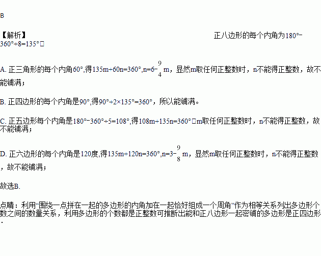 用两种正多边形铺满地面,其中一种是正八边形,则另一种正多边形是( )。