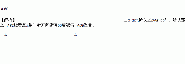 如图,△ABC≌△ADE,∠C与∠AED都是直角,点E在AB上,∠D=30°,那么△ABC绕着点_____逆时针方向旋转_____度能与△ADE重合.