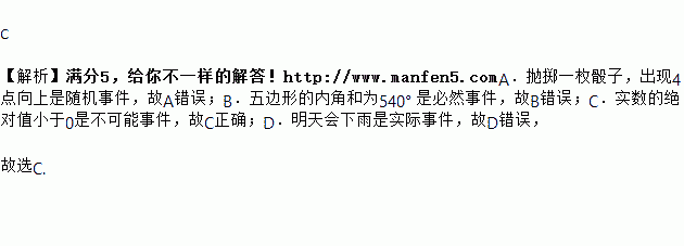 A. 抛掷一枚骰子,出现4点向上 B. 五边形的内角和为540°