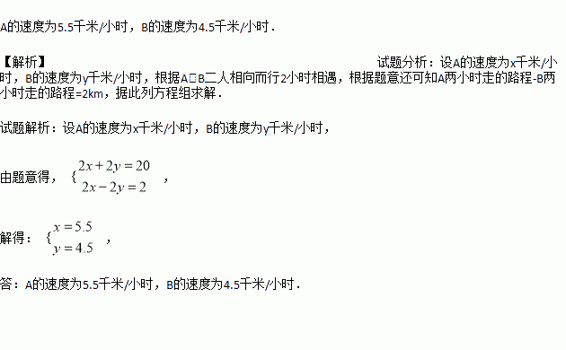 甲乙两地相距20千米,A从甲地向乙地方向前进,同时B从乙地向甲地方向前进,两小时后二人在途中相遇,相遇后A就返回甲地,B仍向甲地前进,A回到甲地时,B离甲地还有2千米,求A、B二人的速度.