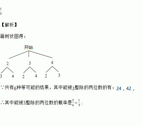 从2,3,4这三个数字中,任意抽取两个不同数字组成一个两位数,则这个两位数能被3整除的概率是________.
