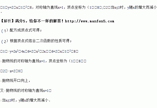 (1)用配方法y=2x2﹣4x﹣6将化成y=a(x﹣h)2+k的形式,并写出对称轴和顶点坐标;