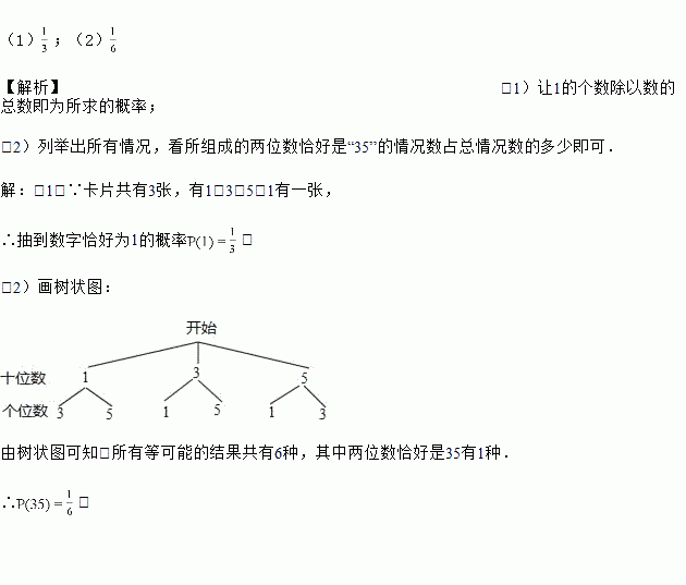 (2)请你通过列表或画树状图分析:随机地抽取一张作为十位上的数字(不放回),再抽取一张作为个位上的数字,求所组成的两位数恰好是“35”的概率.