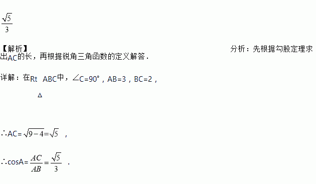 在Rt△ABC中,∠C=90°,AB=3,BC=2,则cosA的值是_____.