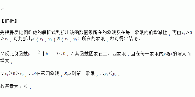 已知,是反比例函数图象上的两点,且,则______填“”或“”.