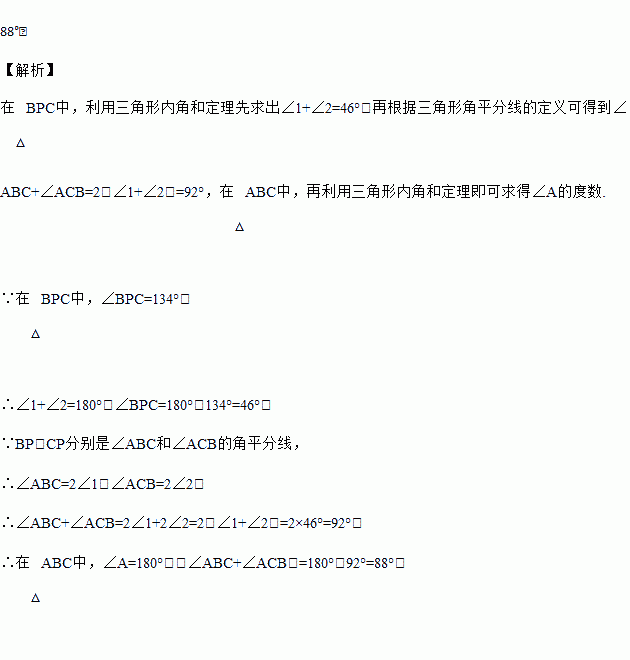 如图所示,在△ABC中,BP、CP分别是∠ABC和∠ACB的角平分线,∠BPC=134°,求∠A的度数.
