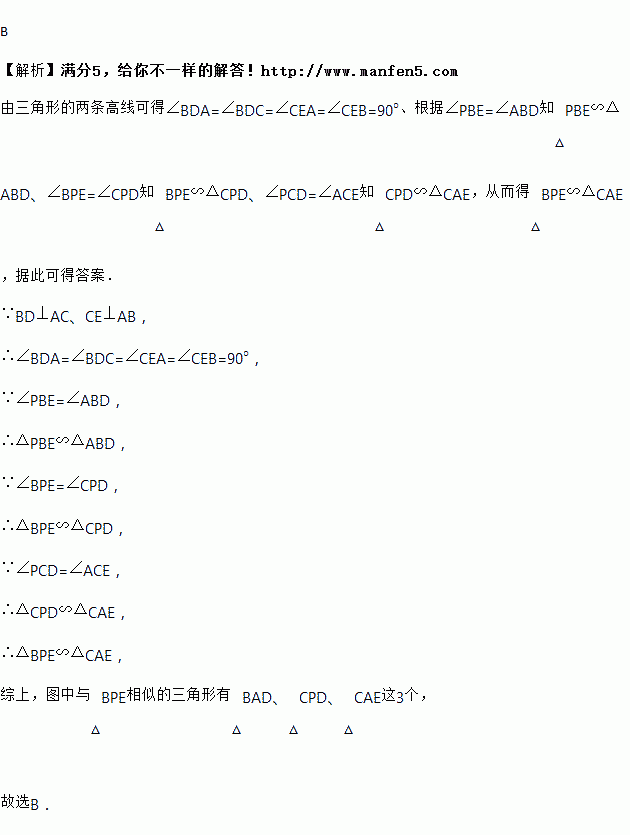 如图,△ABC中,AB、AC边上的高CE、BD相交于点P,图中与△BPE相似的三角形共有( )