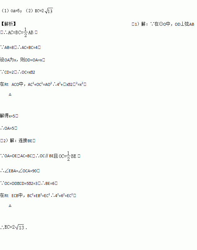 如图,⊙O的半径OD⊥弦AB于点C,连接AO并延长交⊙O于点E,连接EC.已知AB=8,CD=2.