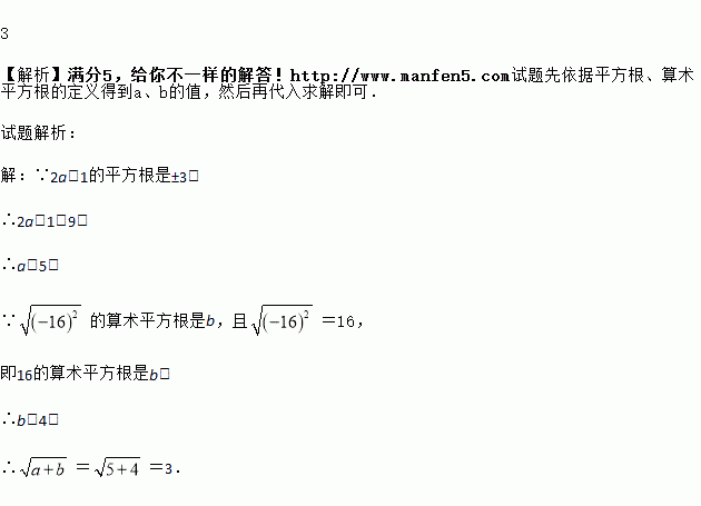 已知2a-1的平方根是±3, 的算术平方根是b,求.