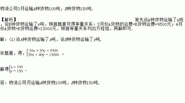 某物流公司承接A、B两种货物运输业务,已知3月份A货物运费单价为50元/吨,B货物运费单价为30元/吨,共收取运费9500元;4月份由于工人工资上涨,运费单价上涨情况为:A货物运费单价增加了40%,B货物运费单价上涨到40元/吨;该物流公司4月承接的A种货物和B种货物的数量与3月份相同,4月份共收取运费13000元.试求该物流公司3月份运输A、B两种货物各多少吨?