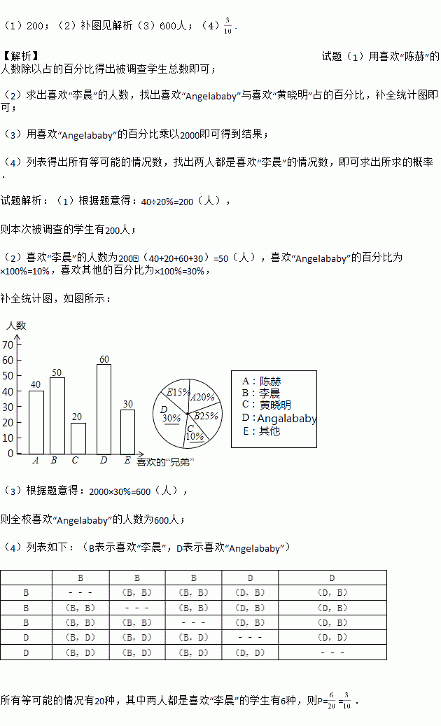 (3)若小刚所在学校有2000名学生,请根据图中信息,估计全校喜欢“Angelababy”的人数.