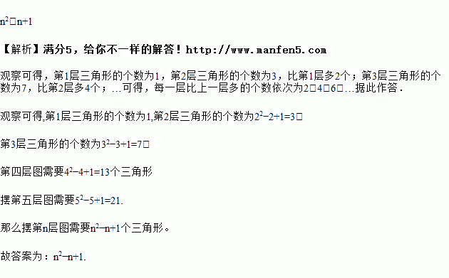 如图,是用三角形摆成的图案,摆第一层图需要1个三角形,摆第二层图需要3个三角形,摆第三层图需要7个三角形,摆第四层图需要13个三角形,摆第五层图需要21个三角形,…,摆第n层图需要_____个三角形.